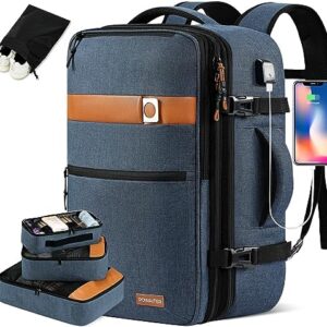 POWAITER Travel Backpack for Women Men, Large Expandable Carry on Backpack Flight Approved with 4 Packing Cubes & Luggage Tag-Navy