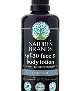 Natural SPF-30 Face & Body Lotion by Herbal Choice Mari (Unscented, 3.4 Fl Oz Glass Bottle) – Made with Organic Ingredients – No Toxic Synthetic Chemicals – TSA-Approved Travel Size