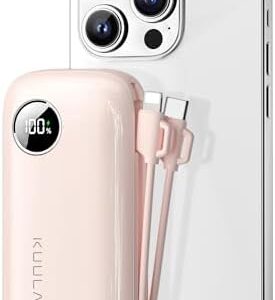 Kuulaa Portable Charger with Built in Cables 10000mAh USB C Power Bank Fast Charging LCD Display Battery Pack Charger Portable 3 Outputs for iPhone Pixel Samsung Android, Pink