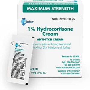 Globe (Box 25 Hydrocortisone 1% Maximum Strength Cream, (0.9g Single Packet) Anti-Itch Cream for Redness, Swelling, Itching, Rash, Bug/Mosquito Bites, Eczema, Hemorrhoids & More