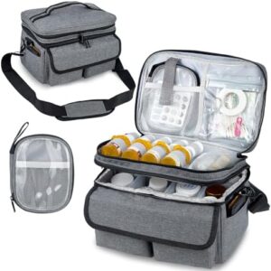 LEIKOLL Medicine Storage Bag, Pill Bottle Organizer with Shoulder Strap, Travel Medicine Organizer Box, First Aid Kit with Portable Small Bag, Medication Bottle Organizer Empty Grey