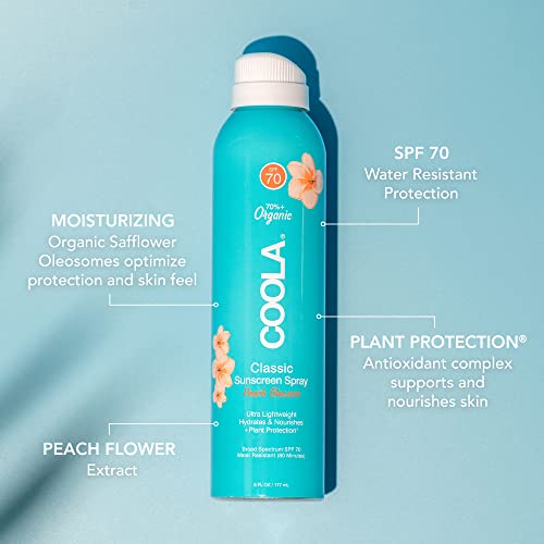 COOLA Organic Sunscreen SPF 70 Sunblock Spray, Dermatologist Tested Skin Care for Daily Protection, Vegan and Gluten Free, Peach Blossom, 6 Fl Oz