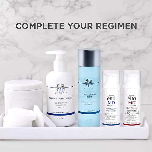 EltaMD UV Daily Broad-Spectrum SPF 40 EltaMD Skincare Foaming Facial Cleanser, Oil-Free, pH Balanced,  All Skin Types, Cleanses Makeup EltaMD Skin Recovery Toner Hydrates,Calms,Restores Skin, for Sensitive, Acne-Prone Skin, EltaMD PM Therapy Repairs and Restores Elasticity and Vitality, for Normal to Dry Skin EltaMD UV Lotion Broad Spectrum SPF 30, Full-Body Sunscreen, Safe for All Skin Types