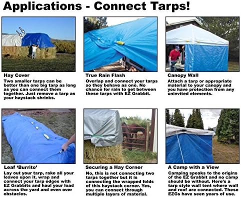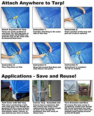 Feature 4: Save and reuse damaged tarps – Many times your tarp is still good but your grommets are torn out. If you’ve invested in an expensive canvas tarp or heavy duty poly tarp a torn grommet is not what you want. EZ Grabbit will extend the life of your tarp for additional years.