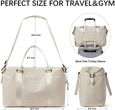 👉Large Duffle Bag:Size :18.5x13x6.5 inch. Duffle Bag for women has Large capacity and multiple compartments. Large main pocket*1,Interior zipper pocket*1,zippered Dry and Wet seperation pocket *1,Interior Open mesh pockets*3 inside. Front open pocket*1,Back zipper pocket*1, Trolley Sleeve*1. Travel Duffle Bag contain your travel/Gym essentials easily and orderly.