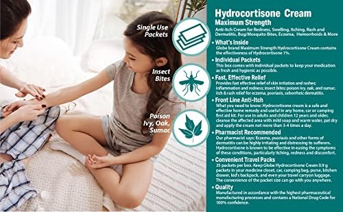 🟢 CONVENIENT TRAVEL PACKS: 25 Packets per Box. Keep Globes Hydrocortisone Cream 0.9 g packets in your medicine closet, car, camping bag, purse, kitchen drawer, kid’s backpack, and even your travel carryon luggage. The convenience of the packet size can go with you anywhere.