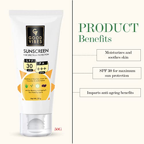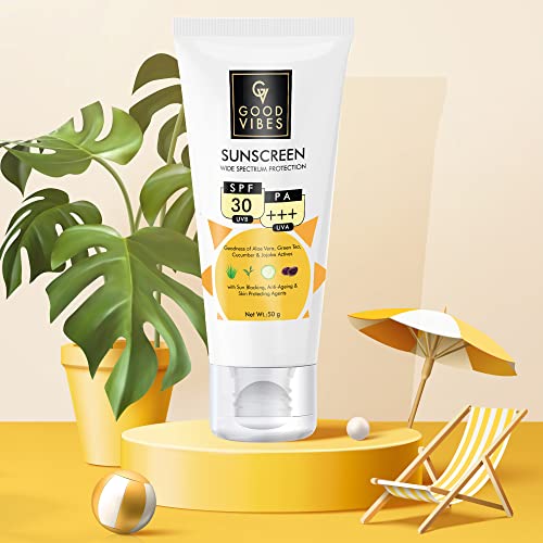 As you move outdoors or are even radiating your shine sitting inside a room protect your skin from the harmful UVA & UVB rays with Good Vibes Wide Spectrum Sunscreen with SPF 30. It helps you protect your skin from damage and dark spots. It doesn’t leave a white cast on your skin and is powered with the natural goodness of Aloe Vera, Green Tea, Cucumber and Jojoba which makes sure to hydrate and nourish your skin while protecting it.The Good Vibes Sunscreen has the goodness of Aloe Vera, Green Tea, Cucumber and Jojoba actives that nourish and moisturize your skin while protecting it from the sun. With SPF 30 PA +++ UVA and UVB protection, get maximum protection throughout the day. It is lightweight and non-greasy making it extremely easy to wear. It is also additionally enriched with anti-ageing and skin protecting agents
