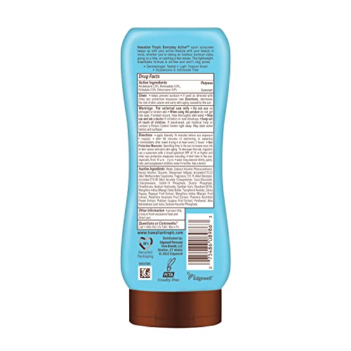 Hawaiian Tropic Everyday Active Sunscreen Lotion SPF 15 is an ultra-light, high-performance sunscreen that keeps up with your everyday active lifestyle with your beauty in mind, whether you’re taking your favorite outdoor workout class, hiking with your dog, or catching a few waves. This breathable formula is made with shea butter and jojoba butter, is oil-free, and won’t clog pores, so you can feel good about applying and re-applying throughout the day. This sunscreen is water and sweat resistant, and it won’t sting your eyes. Hawaiian Tropic Sport sunscreen is dermatologist tested and made with island-inspired botanicals and ingredients like papaya, mango, passion fruit, plumeria, guava, and aloe for skin-loving suncare you can trust. We care for your skin with broad spectrum UVA and UVB protection, and we also do our part to help care for the planet by creating Cruelty-Free sunscreen that’s free from oxybenzone and octinoxate.