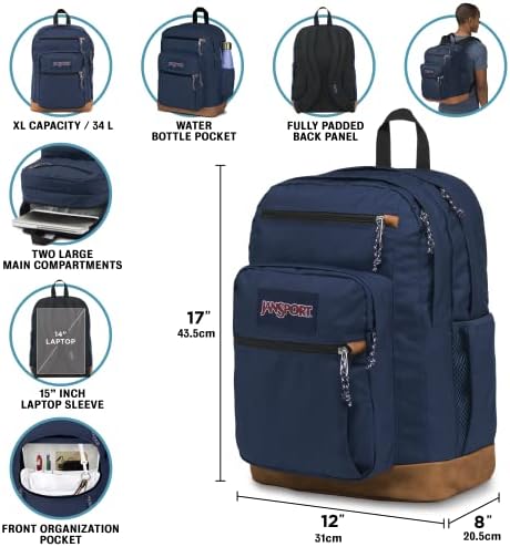 JanSport Cool Backpack – All the great features of our Big, plus a sleeve for a 15 inch” laptop and synthetic leather base &; trim. Go ahead, say it: That’s cool. EXTRA LARGE CAPACITY – Plenty of space to stash lots and lots of stuff. WATER BOTTLE POCKET – Stay hydrated on your daily adventures. PREMIUM DETAILS – A little something special went into this pack. Ergonomic S-curve shoulder straps, Fully padded back panel, Side water bottle pocket, Internal 15″ laptop sleeve, Cord pullers, Two large main compartments, Pleated front stash pocket, Web haul handle, Premium synthetic leather bottom and trims. CAPACITY: 2100 cu in/34 L, DIMENSIONS: 17.5″ x 13″ x 10″/43 x 33 x 25 cm, FABRIC: 600 Denier Polyester/Synthetic Leather, WEIGHT: 1 lb 5 oz/0.6 kg, LAPTOP DIMENSIONS: 13.4″ x 11.8″ x 1″/34 x 29 x 3 cm