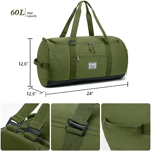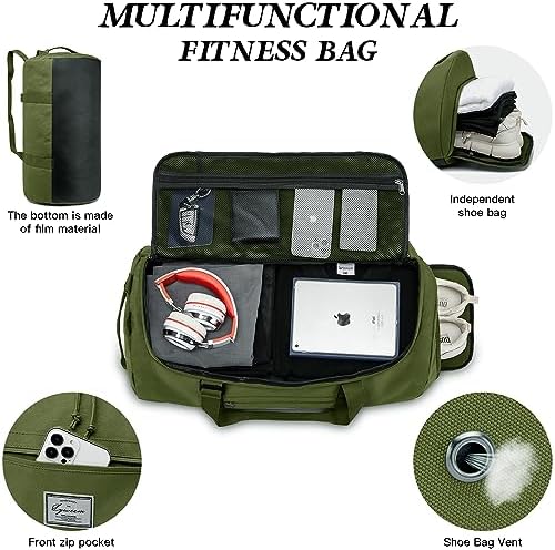 Color: Balck / Green / BrownMaterial: 100D Waterproof PolyesterDimensions : 24″ x 12.6″ x 12.6″; Capacity:60 L; Weight: 1.21 lbsUsage scenarios: travel, gym for a workout, weekend short trips, overnight bags, hospital bags, picnics, beaches, college, etcSo no matter where life takes you, this bag is the perfect companion for all your travel and daily needs.