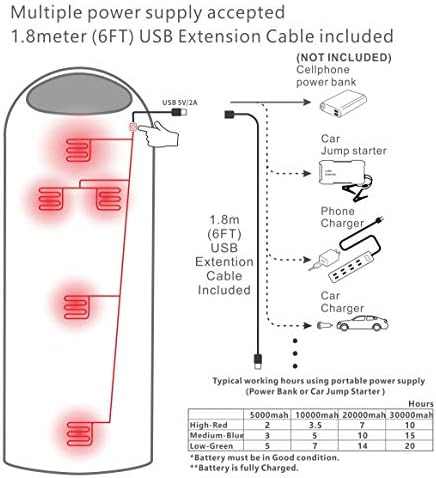 2.If using power bank or smaller jump starter, you can plug the USB port in power bank or jump starter and then put it into the inner pocket. If you want to use the cellphone or car charger, just use the USB extension cable(included) to connect the heated sleeping bag with power supply.