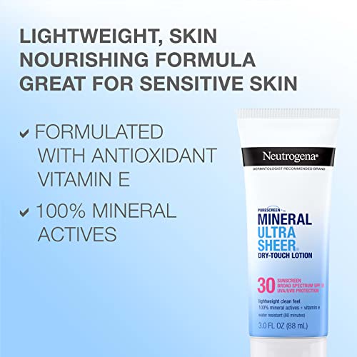 Protect your skin from sun exposure with Neutrogena Mineral UltraSheer Dry-Touch SPF 30 Sunscreen Lotion. Ideal for sensitive skin, this broad-spectrum sunscreen with SPF 30 has a formula with a lightweight, clean feel that helps prevent sunburn when used as directed. The sheer lotion from the #1 dermatologist-recommended sun care brand contains titanium dioxide & zinc oxide for optimal protection from skin-aging UVA rays & skin-burning UVB rays. The non-chalky, dry-touch lotion is formulated with the antioxidant Vitamin E as well as 100% mineral actives, & contains no chemical actives, including oxybenzone. Shine-free & fast-absorbing, the mineral sunblock leaves skin feeling nourished & clean. Apply the broad-spectrum lotion liberally 15 minutes before sun exposure & reapply at least every two hours. UltraSheer Dry-Touch lotion is water resistant for up to 80 minutes when used as directed; reapply after 80 minutes of swimming or sweating & immediately after towel drying.