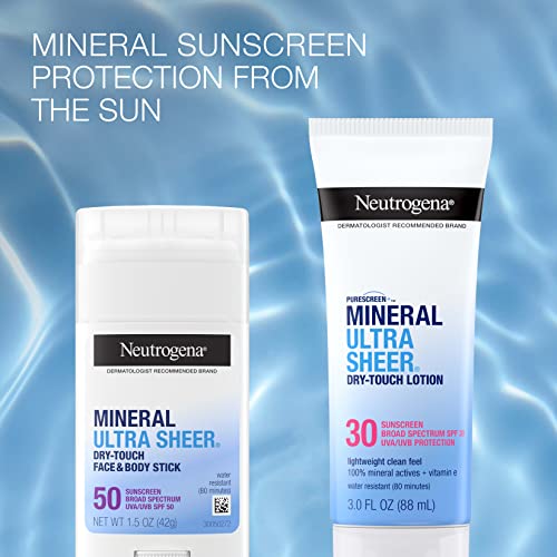 From a dermatologist-recommended brand, Neutrogena Mineral UltraSheer Dry-Touch lotion is water resistant for up to 80 minutes when used as directed. Reapply the SPF 30 lotion after 80 minutes of swimming or sweating & immediately after towel drying