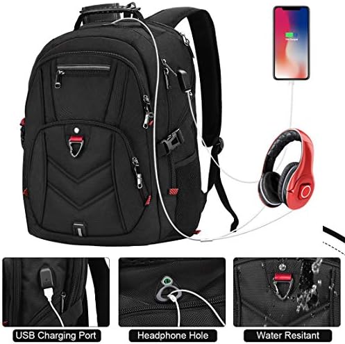 1* Padded Laptop Compartment: TSA-Friendly designed, shockproof padded sleeve compartment Fits laptop up to 17.3 inch. 2* Main Compartment:Clothes,Travel accessories,Books,Binders,tech electronic accessories,shoes,etc.2* Front Zipper pockets( includes 5 divider small pockets with key chain).2* Side zipper pockets for your compact umbrella and small accessories. 2* Water bottle pockets: Two mesh pockets on each side fit bottle. 1* Exterior USB port & Top headphone hole.