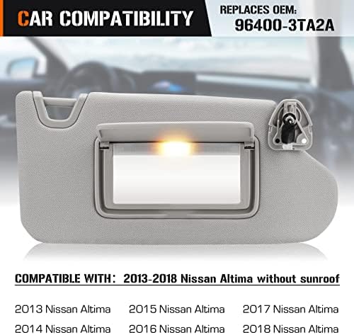 Feature Mirror Built-in Led Light Color Gray Replaces OEM 96400-3TA2A Material ABS, High-quality Stretch Cotton Size 15.91″ x 7.17″ x 2.24″, weighs 1.43 BL Package 1 X Right Passenger Side Sun Visor