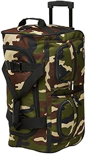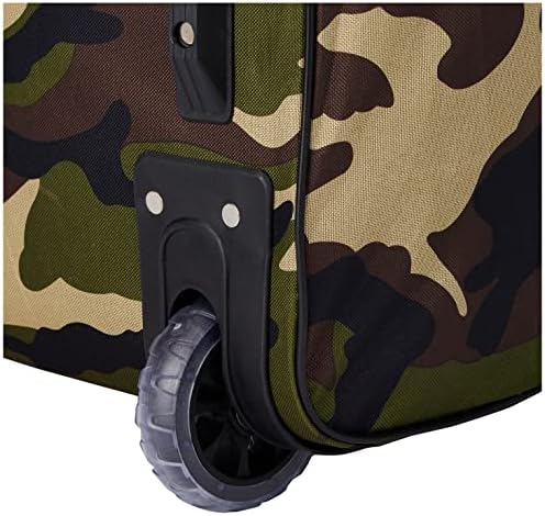 Travel in style with this great soft-sided rolling duffle bag. Bag features a heavy duty polyester construction. Inline skate wheels for superior mobility, internal retractable hide-away handle system, u-top opening provides easy access to roomy zipper secured main compartment. Two front zipper-secured compartments, adjustable ergonomic shoulder strap. Made of 600 denier heavy duty polyester. Measures 22″ L x 12″ W x 11″ H