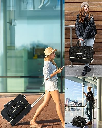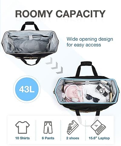 43L Large Capacity: With spacious internal space and multi-pockets, it was very deep, roomy, spacey. This travel duffel bag adopts Large U-shaped top opening, which is convenient for quickly getting items. It made it easy to stay organized. It is also equipped with a 15.6 laptop compartment+2 mesh pockets for storing electronic equipment. It can meet travel of at least 5 days.