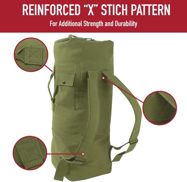Rothco’s Canvas Double Strap Duffle Bag is the perfect enlarged bag you can take with you anywhere! Made of 22oz heavyweight cotton canvas material, the military duffle bag is built with the utmost durability to last long ventures. Measuring 22” X 38”, this travel duffle bag has enough room to store tons of clothes and gear you need for your next trip. Wherever you travel, you can carry your canvas sports bag with the sturdy carry handle, or the convenient adjustable backpack shoulder straps. The canvas duffle bag comes with a 4 ¾” X 7 ½” snap closure side pocket to store additional items. Metal clip top closure keeps your gear properly stored wherever you go. Whether you plan a long or short trip, or just taking a trip to the laundromat, Rothco’s canvas sports bag is the optimal choice to store all the gear you need.