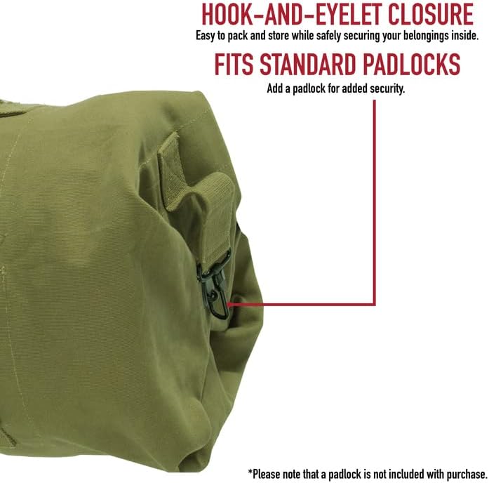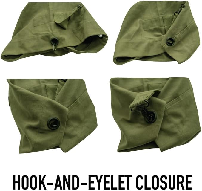 RUGGED G.I. CANVAS DESIGN: The G.I. Style Canvas Duffle Bags feature a top loading layout that makes it easy to pack and store large amounts of clothing and gear. After packing, secure your belongings inside with the metal hook-and-eyelet clip closure. There’s also a snap-button closure side pocket for quick access to small items.