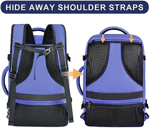 ✈【BUILT FOR TRAVEL】: This purple carry on backpack for women is designed with hideaway padded shoulder straps which can be hidden away in the back zippered compartment, transforming carry on backpack into suitcase backpack. Two padded grab handles are set on the top and the side of the backpack for women travel bag, which allow an easy switch between backpack and suitcase. A luggage strap on the back is designed to fit on suitcase for easy carrying. It’s the best gifts for travellers women