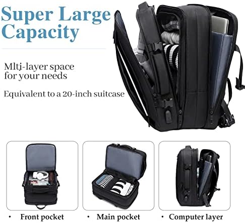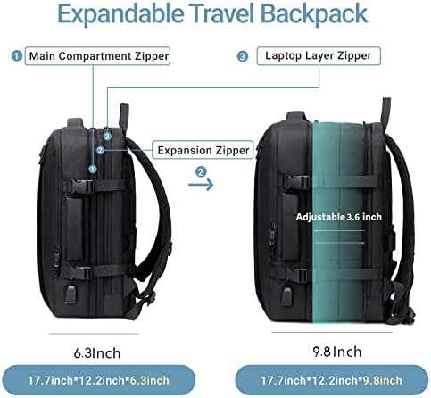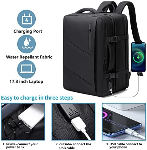 Travel Laptop Backpack, Extra Large 25-40L Expandable Carry On Backpack for Women Men with USB Charging Port, Water Resistant Luggage Computer Backpacks Bag Fits 17.3 Inch Laptop and Notebook, Black