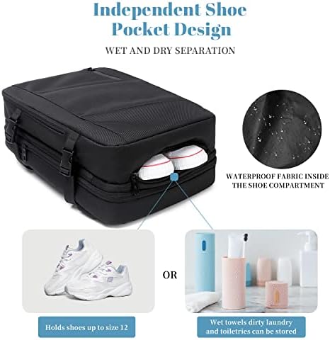 Shoe Compartment: One shoe compartment is crafted to bottom of backpack carry on to keep the shoes seperately and everything else clean. This shoe storage is wide enough to hold size 11 for both lady shoes and man shoes which can also be used as toiletries bags and for other uses. Colleges backpack is Good choice for mens womens. A great companion for commuting, business trip, hiking, travel, camping and other outdoor activities.