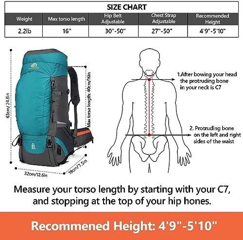 Specifications: Item type: Hiking Daypack Material: Nylon (water-resistant, tear-resistant) Gender: Unisex (Men, Women) Capacity: 50L (65LMAX) Size:63*32*19cm/24.8*12.6*7.5 inch Weight: 2.2lb/ 1020g Package Include: