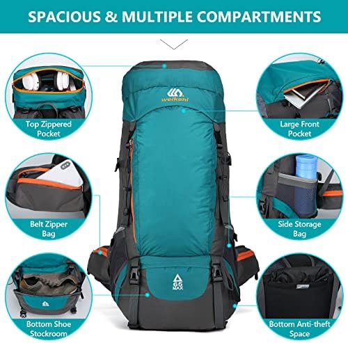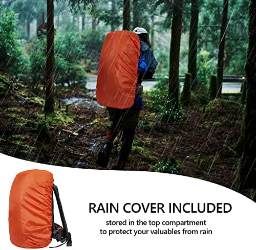 【Large Capacity & Waterproof】: Camping backpack is designed with multiple compartments for easy storage. The climbing backpack features 10 pocket compartments, including 1x top pocket, 1x top inner pocket, 1x drawstring main pocket, 1x front pocket, 2x mesh bags, 2x side pockets, 1x bottom pocket and 1x rain cover storage pocket.