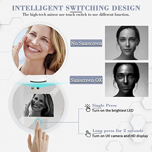 ☀️【Intelligent switching design】The hand held uv mirror use touch switch to use different function. When long press the switch it will open UV camera and display screen. Now you can see how sunscreen applied to your face. Short press the switch it will shut the camera and display screen and open the lightest LED lights. Short Pressing the switch again will lower the brightness in turn. The makeup light mirror is very convenient to use.