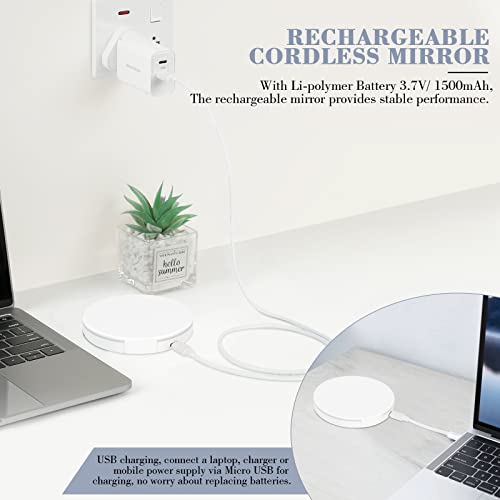 ☀️【Rechargeable Cordless Mirror】With Li-polymer Battery 3.7V/ 1500mAh,The rechargeable mirror provides stable performance. USB charging, connect a laptop, charger or mobile power supply via Micro USB for charging, no worry about replacing batteries. The portable mirror is very convenient for men’s shaving and women’s makeup.
